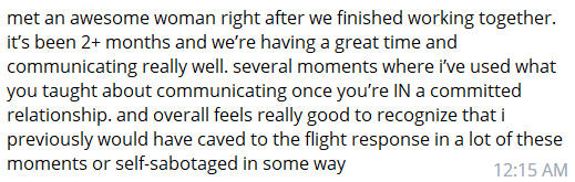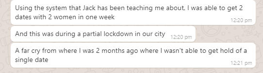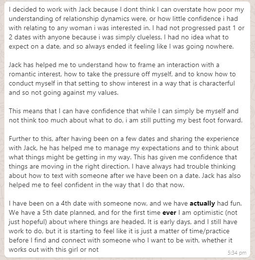 ‘Johnson’ went from a “clueless” 26 year old virgin to having a 5th date planned with a quality woman in 4 weeks working with me.3 months on from that testimonial? He’s still in a relationship with the same girl.In fact, he was so happy he “literally cried”.