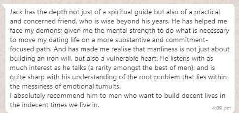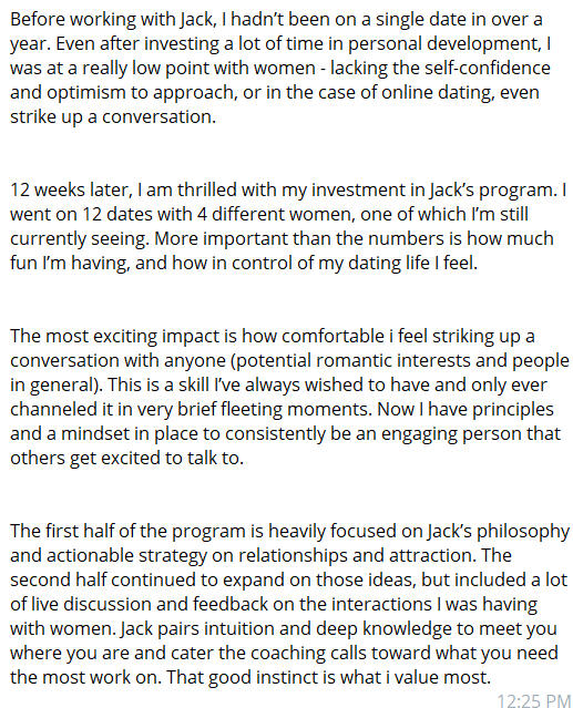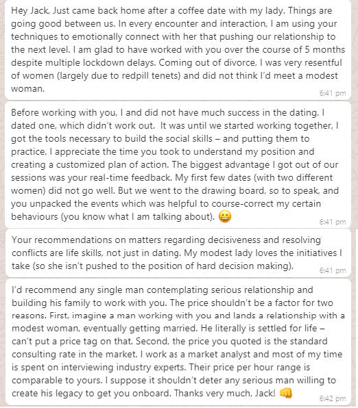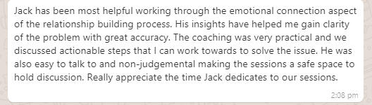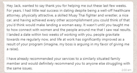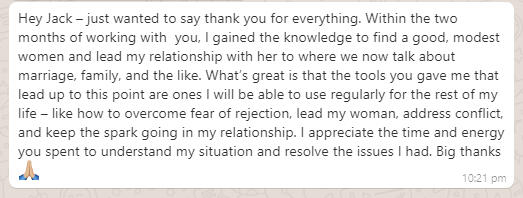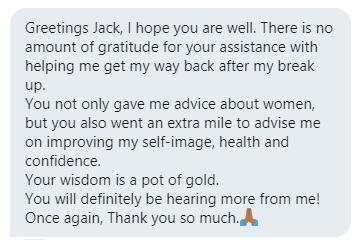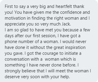 Well, let’s have a look at what one of my former clients said:"Eventually, I took the risk and pulled the trigger. And man, am I glad I did... Now I am building a healthy relationship with a wonderful woman and without a doubt I attribute it to your services. Thanks, Jack."
