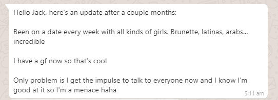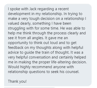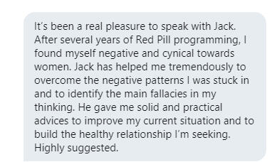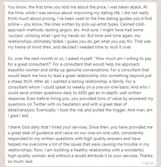 Well, let’s have a look at what one of my former clients said:"Eventually, I took the risk and pulled the trigger. And man, am I glad I did... Now I am building a healthy relationship with a wonderful woman and without a doubt I attribute it to your services. Thanks, Jack."