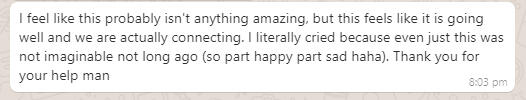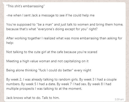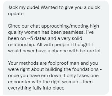 ‘Johnson’ went from a “clueless” 26 year old virgin to having a 5th date planned with a quality woman in 4 weeks working with me.3 months on from that testimonial? He’s still in a relationship with the same girl.In fact, he was so happy he “literally cried”.